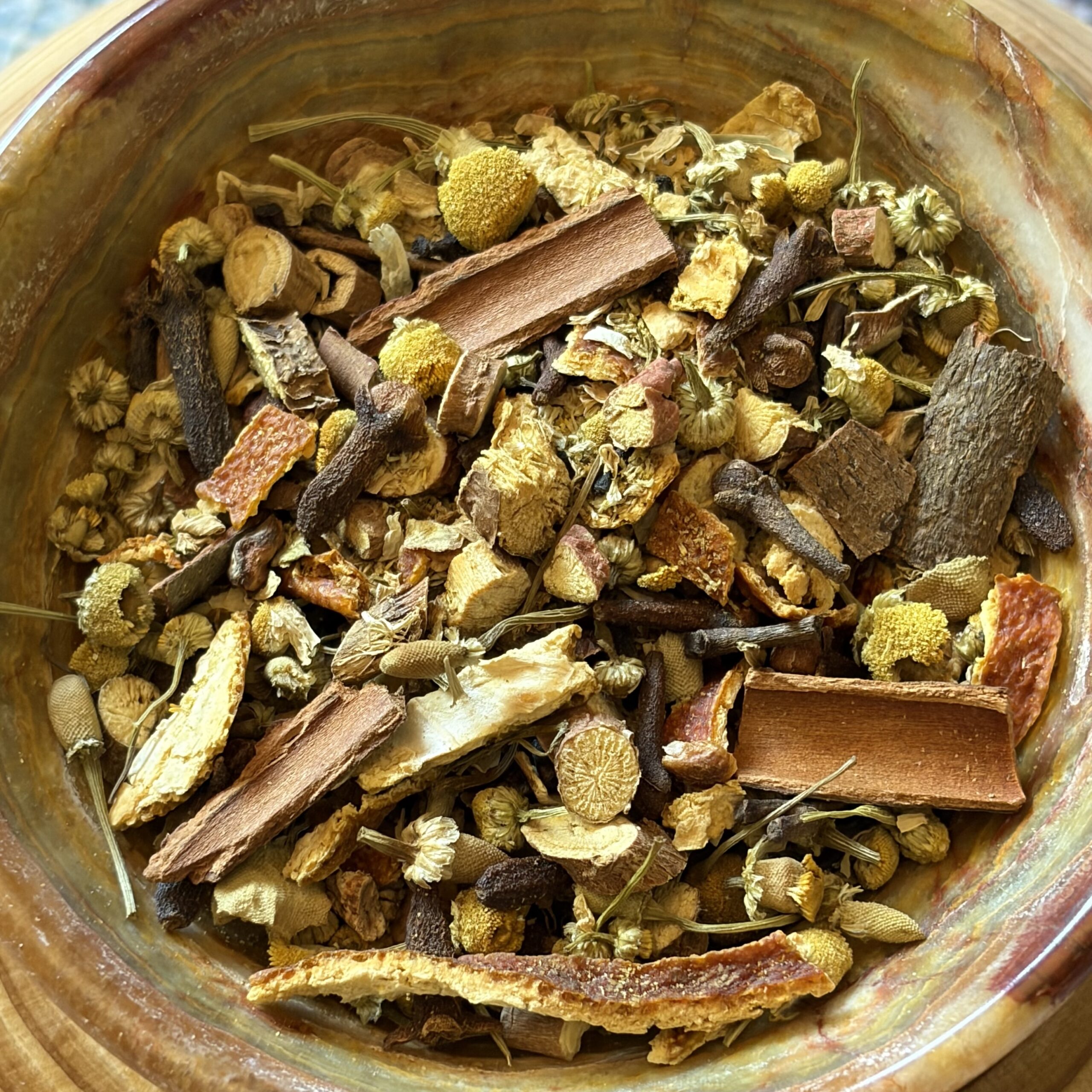 Licorice root coats and softens irritated tissues while chamomile calms inflammation and supports gentle healing. Bright orange peel lifts the blend and aids digestion, while warming cinnamon and clove encourage circulation and bring comforting heat to the chest and throat. The result is a smooth, aromatic infusion traditionally enjoyed during cold weather or when the throat needs extra care.